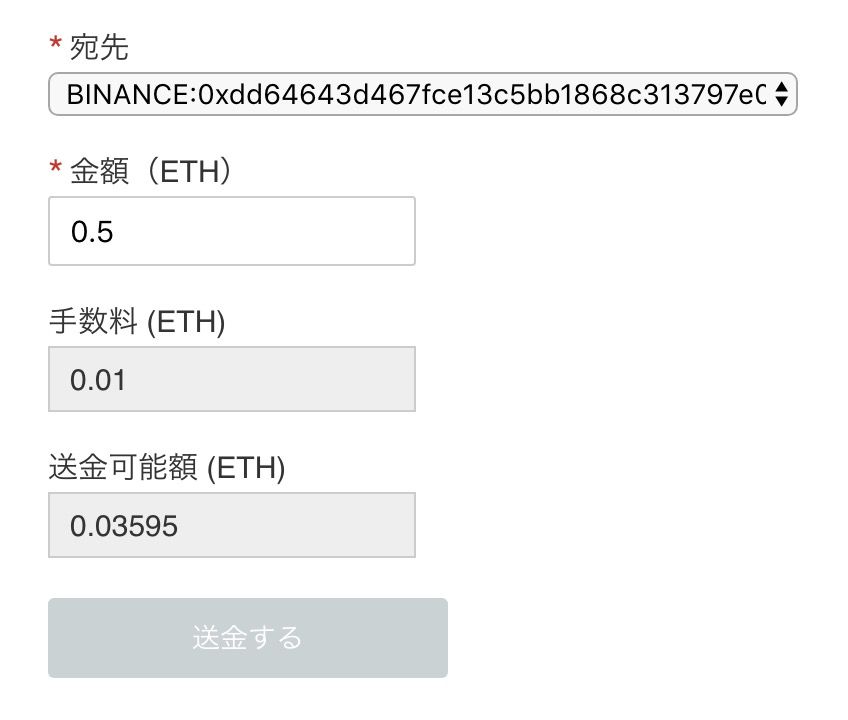 ドロップダウンから先ほど登録したラベル「BINANCE」を選び、入力欄に送金するETHの金額を入れたら「送金する」をクリック。